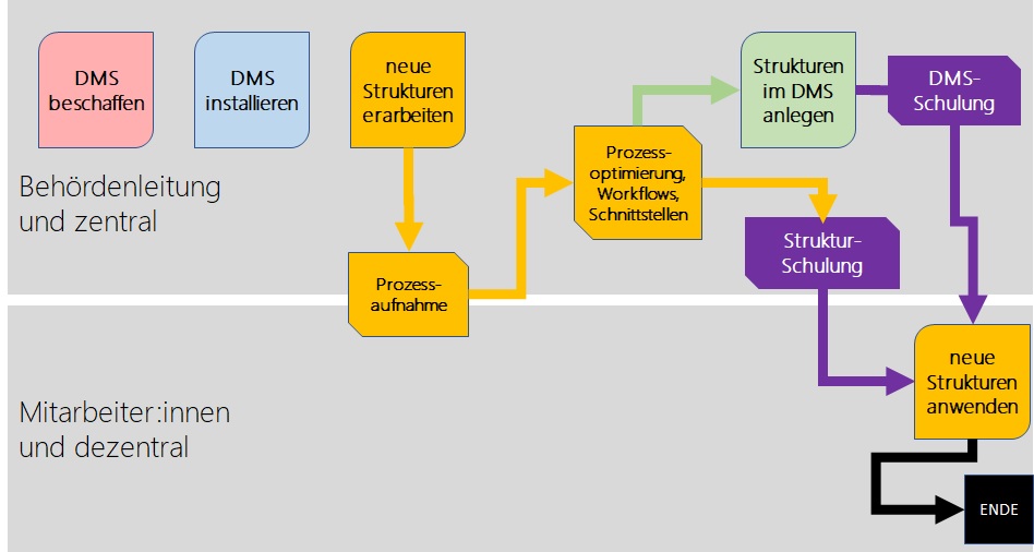 „Wegen der mit der Einführung eines Dokumentenmanagementsystems verbundenen Umstellung auf eine elektronische Aktenführung handelt es sich hierbei in erster Linie um ein Organisationsprojekt (und kein IT-Projekt). (…) Auch die Mitarbeiter/-innen sollten möglichst frühzeitig eingebunden und über das Projekt und die damit verbundenen Auswirkungen auf ihre persönliche Arbeitsweise informiert werden.“ /Anmerkung 2/