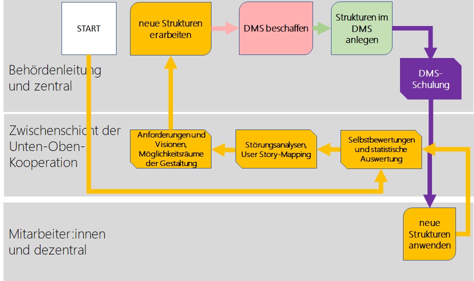 Es gibt eine andere Vorgehensweise, die sich auf den ersten Blick – vor allem was den Projektplan betrifft – nur wenig vom strikt autoritären Modell zu unterscheiden scheint. Aber es steckt ein ganz anderer Anspruch dahinter, der mit der Einführung der digitalen Akte verbunden wird: nämlich der Anspruch einer Optimierung der Arbeitsmöglichkeiten der Beschäftigten, statt ihrer Gängelung und Einhegung aller Initiativen von unten den Vorzug zu geben.