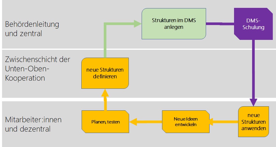 Der zweite Unterschied zu den Top-Down-Modellen: Das Projekt geht in eine permanente Verbesserungskultur über. Die Mitarbeiter:innen können sich selbst organisieren und so das DMS immer mehr in Richtung auf ihre Bedarfe anpassen. Das heißt, die neuen im Projekt erfahrenen Arbeitsweisen der Selbstorganisation und der Indienststellung der Software für die Mitarbeitenden (statt umgekehrt) kann – wenn dies zugelassen wird – auch die Routinearbeit nach Projektende in der Breite nachhaltig beeinflussen. Das Projekt wird dann nicht nur als OE-Projekt etikettiert, sondern OE wird gelebt.