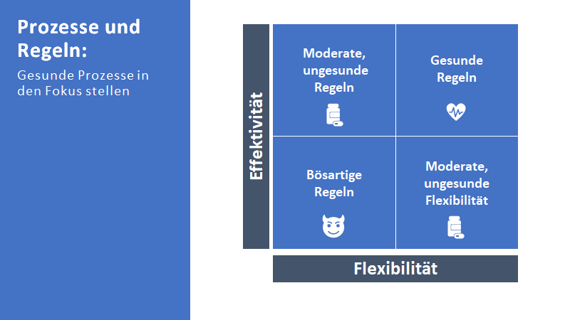 Gute Prozesse sind nicht schlank (kostenoptimiert), sie sind gesund und vital. Das ist ein großer Unterschied. Was sind gesunde Prozesse? Ich persönlich finde die Unterscheidung auf Basis der zwei Dimensionen Flexibilität und Effektivität sehr spannend und zutreffend. Auf Basis dieser Differenzierung ist ein erster Gesundheitscheck möglich. Diesen Gesundheitscheck hatten wir bereits in einem Blogartikel im Oktober 2021 vorgestellt. Gesunde Prozesse sind effektiv und flexibel, nicht kosteneffizient und im kleinsten Detail durchnormiert. Sie helfen uns, das richtige, das gewünschte Ergebnis zu erzielen und bieten uns ausreichend Flexibilität, um ggf. auf Besonderheit reagieren zu können, ohne den Erfolg zu gefährden.