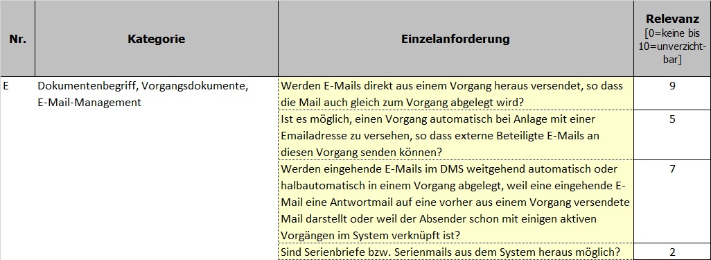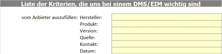 Der ganze Block im Tabellenkopf ist dann wichtig, wenn man die Liste in Bezug auf mehrere verschiedene DM-System ausfüllen lässt und sie zum Vergleich nutzen will. Wir haben auch ein weiteres Tool, in das man die Ergebnisse verschiedener ausgefüllter Bögen einlesen kann und dann eine Auswertung erhält (wer es haben will, schickt uns eine E-Mail an kontakt[ätt]agile-verwaltung.org, Betreff „Auswertungstool Kriterienliste“).