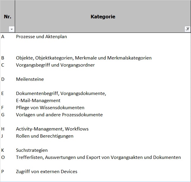 Darunter sind, wie man sieht, auch Anforderungen, die man oft gar nicht im Fokus hat, wenn man sich nicht schon sehr gründlich mit digitaler Schriftgutverwaltung beschäftigt. So zum Beispiel Kategorie „B: Objekte, Objektkategorien…“, also die Verwaltung von Stammdaten zu Kontakten, eigenen Abteilungen, Gebäuden, Flurstücken usw. Viele Produkte sehen das gar nicht vor, und dann später im Projekt stößt man auf Schwierigkeiten.
