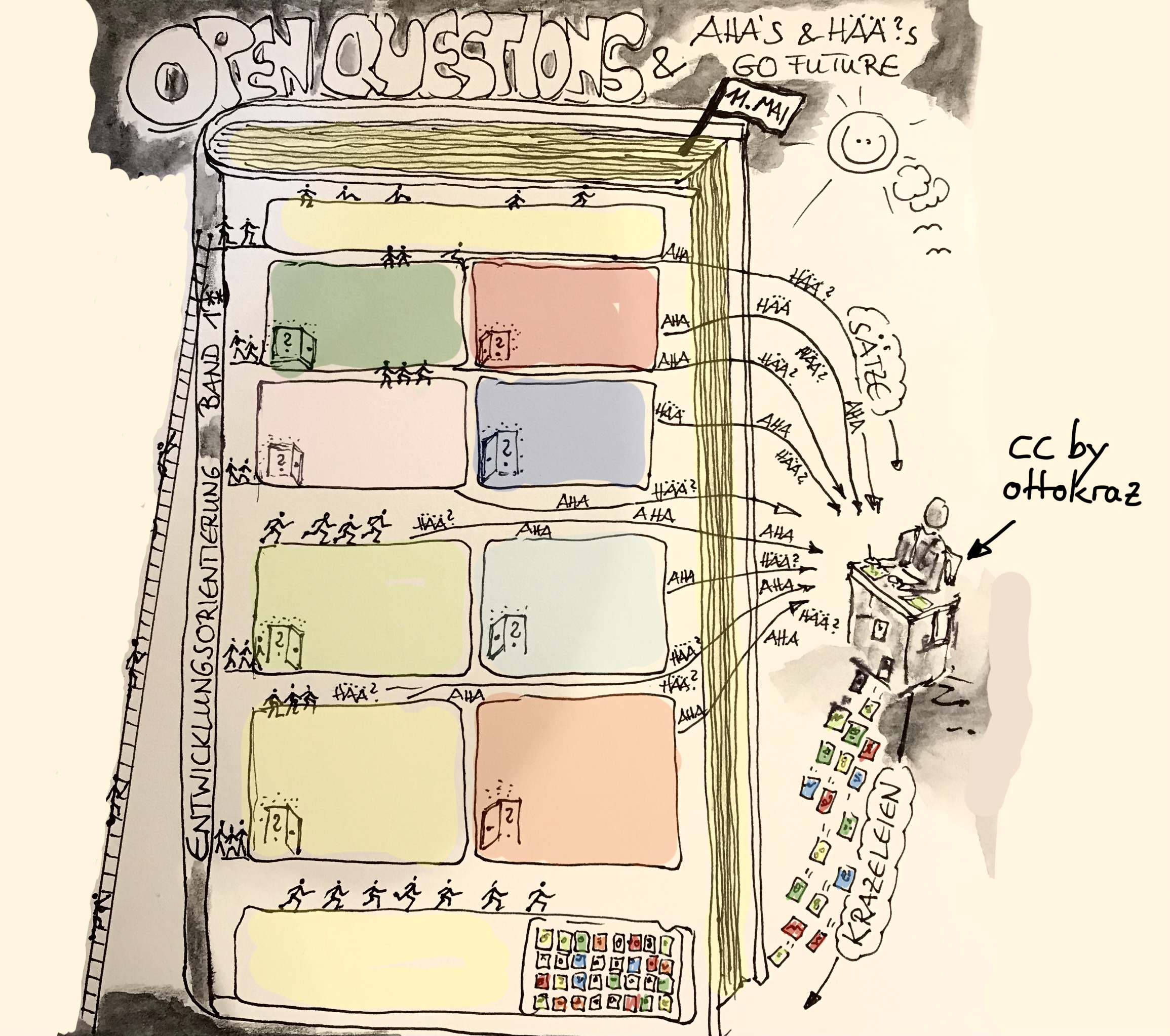 Ich selbst hatte die Veranstaltung nur über die Aha-Sätze und die Open Questions «erlebt» und das war dabei mein ganz eigenes Aha-Erlebnis. Wenn Sie sich die visualisierten Sätze angesehen haben, dann wissen Sie wahrscheinlich automatisch, was ich meine.