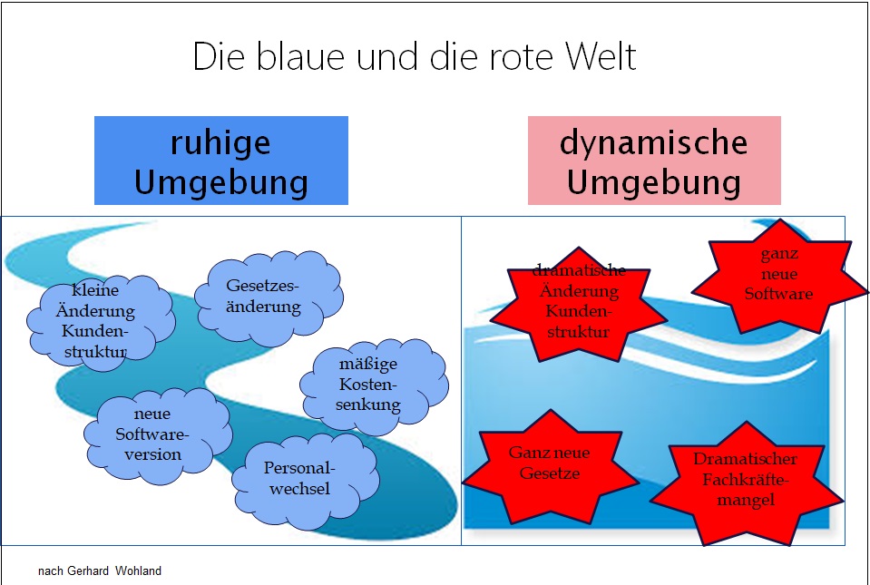 Abbildung 4: In der roten Welt muss die gesamte Organisation die Umgebung beobachten und sich Gedanken machen, wie sie auf neue Herausforderungen reagieren könnte.
