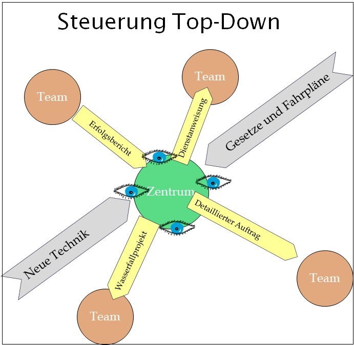 Die blaue Welt soll die herkömmliche Umgebung symbolisieren, für die unsere Verwaltungen gut aufgestellt wurden. Sie ist durch einen stetigen Fluss kleinerer Änderungen gekennzeichnet, auf die unsere Organisationen gut und verlässlich mit ihren gewohnten hierarchischen Führung reagieren können. Bei dieser Konstruktion der Top-Down-Steuerung (Abbildung 3) reagiert nur das Zentrum der Organisation – die oberste Führung – auf die Änderungen der Umgebung – egal, ob es sich um neue Techniken handelt, die eingeführt werden können oder müssen, ob es neue Gesetze gibt oder neue Handlungsanweisungen („Fahrpläne“) von Bund oder Ländern.