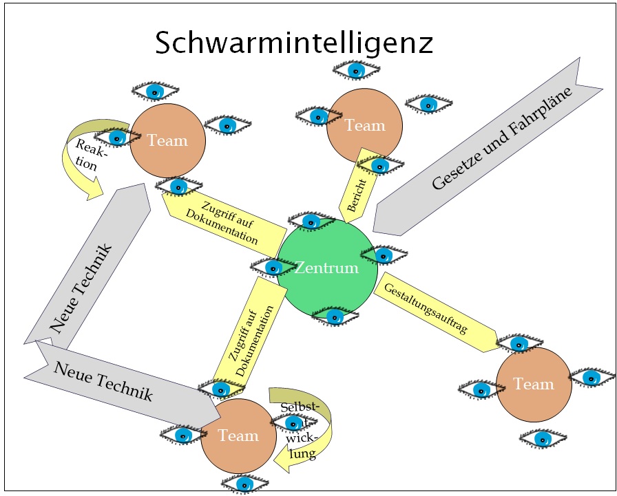 Schwarmintelligenz bedeutet: Alle Mitarbeiter:innen müssen sich am Erkunden, Ausprobieren und an der Detailplanung der neuen Technologien beteiligen. Die herkömmliche Methode, dass die oberste Führung alles bis ins kleinste voraussieht und in einen Plan gießt, funktioniert nicht mehr.