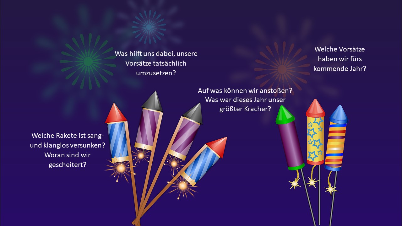 Hier sind Fragen, die Du bei Deiner Silvester-Retrospektive stellen könntest. Du kannst sie alleine, zu zweit, im Team oder in Deiner Familie machen.