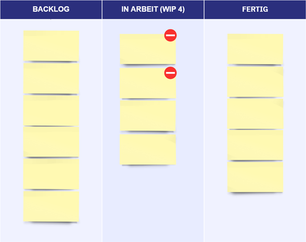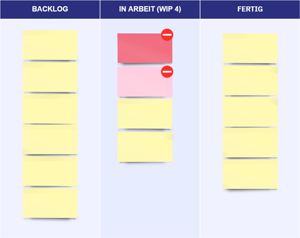 Eine weitere Variante ist das Hervorheben eines blockierten „Tickets“ mit einem visuellen Signal. Dies kann ein Avatar, ein Symbol oder eine andere einfache Kennzeichnung sein. Bei dieser Variante wird das blockierte Ticket dem WiP-Limit zugeordnet. Neue Tickets können nicht nachgezogen werden. In Abbildung 2 haben wir ein Beispiel dargestellt.