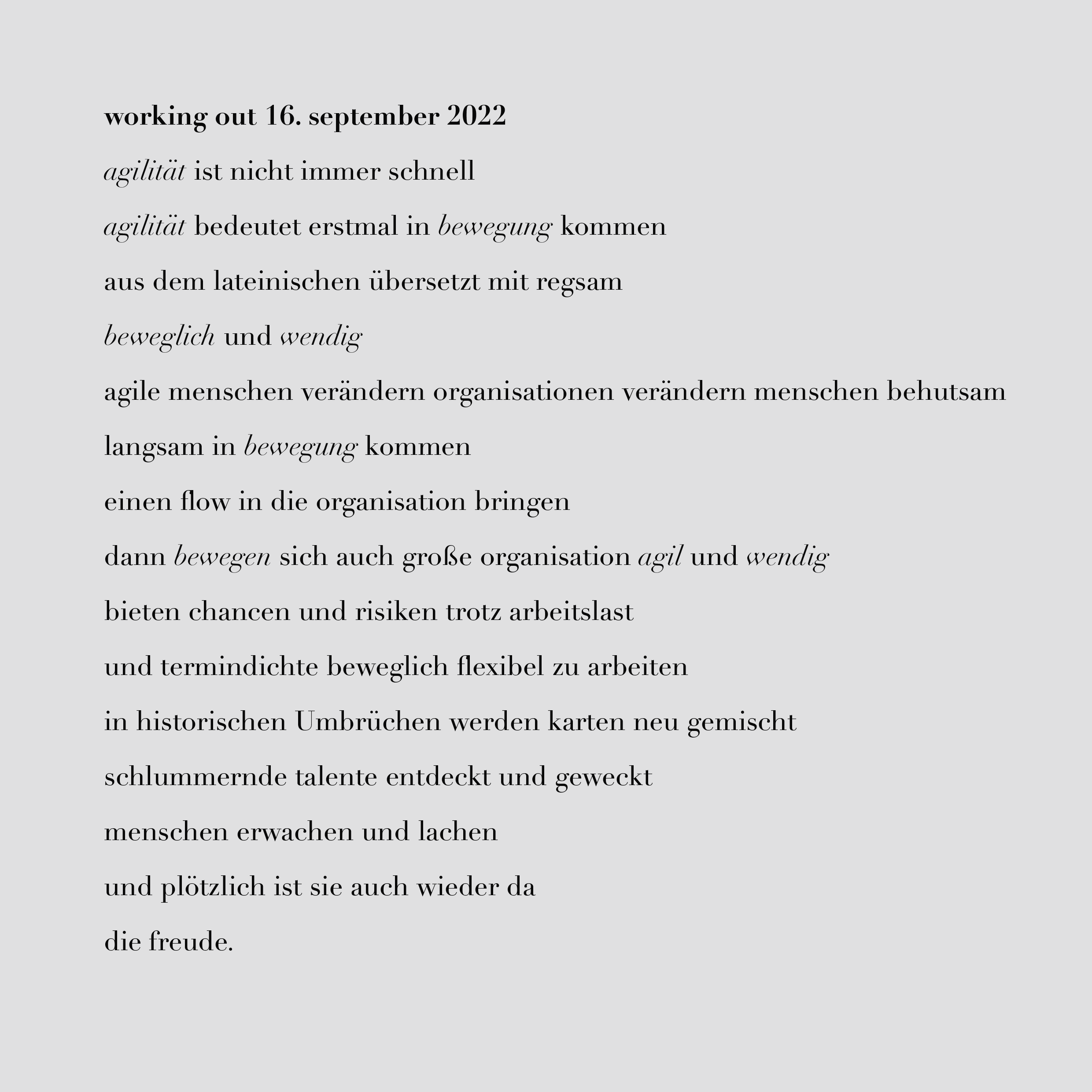 „Geistige Entspannung! Auf eine Sache konzentrieren. Mit etwas Abstand reagieren. Zeit für konzentriertes Arbeiten in Anspruch nehmen. Pausen einhalten. Danke! – Gleich geht’s ins Grüne zu einem schönen Spaziergang.“
