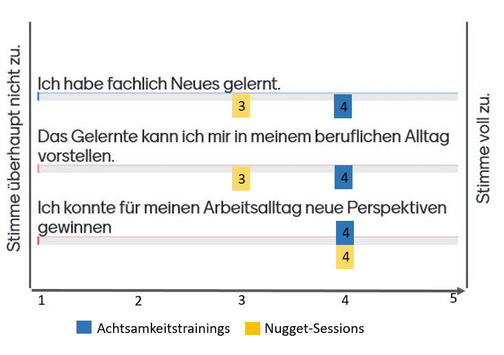 Im Rahmen des Projekts wurden Achtsamkeitstrainings mit zwei unterschiedlichen Schwerpunkten angeboten. Ein Training beschäftige sich thematisch mit der „Verbindung von Agilität und Achtsamkeit“ und machte deutlich, wie beides zusammenhängt: Mit Achtsamkeit kultiviert man die notwendige Haltung im Sinne von Selbstführung und Reflektion, die es für die erfolgreiches agiles Arbeiten braucht. Das andere Achtsamkeitstraining thematisierte den „Mythos Multitasking“. Hierbei wurde deutlich, dass es keine Gleichzeitigkeit gibt. Wenn E-Mails während einer Konferenz bearbeitet oder während eines Telefonats gelesen werden, machen wir nicht wirklich etwas gleichzeitig, sondern wechseln schnell zwischen den Aufgaben und teilen dadurch unsere Aufmerksamkeit. Das Resultat ist ein deutlich stärker wahrgenommener Zeitdruck und damit verbunden Stress und Erschöpfung. Ziel des Trainings war es, in einer persönlichen Reflexion typische Multitasking-Momente zu identifizieren und gemeinsam mit den Teilnehmenden zu überlegen, was anders gemacht werden kann. Das Ergebnis: mehr fokussierte Single-Tasking-Arbeiten, weniger Zulassen von Ablenkung, Einlegen von mehr Pausen und das Schaffen kleiner „Ruheinseln“, manchmal kann auch „Nein, jetzt bitte nicht“ helfen. Insgesamt gab es 51 Teilnahmen an den insgesamt sechs Trainings (teils virtuell, teils in Präsenz) .