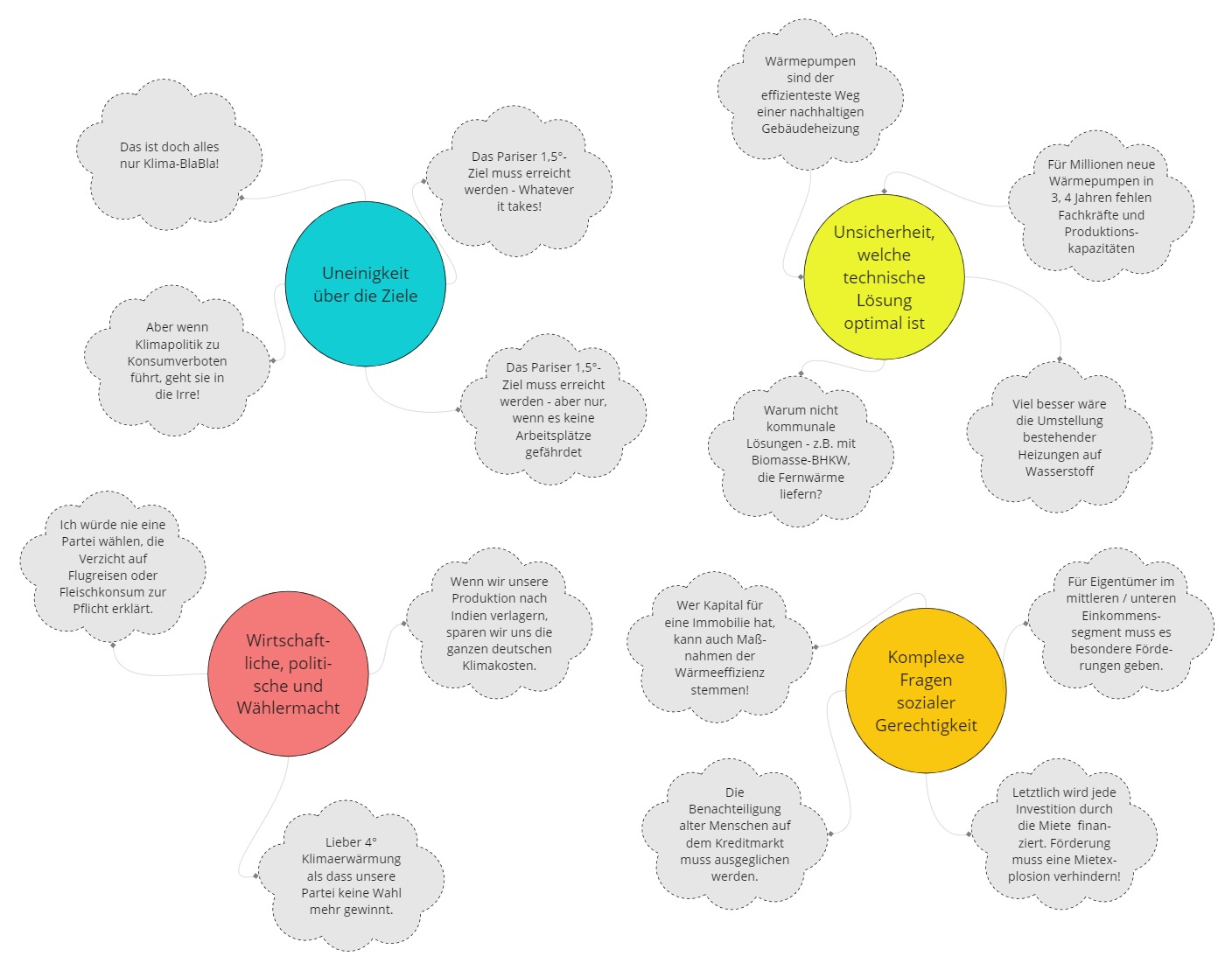 Die Gründe für diesen Schwenk scheinen mir vielfältig. Einfache Schuldzuweisungen jedenfalls greifen zu kurz. Auf jeden Fall haben sie etwas mit Komplexität zu tun: es gibt verschiedene Dimensionen von Unsicherheit, mit denen Klimapolitik konfrontiert ist – und zwischen diesen Dimensionen gibt es Wechselwirkungen. Um es für mich selbst klarzukriegen, habe ich versucht, diese Dimensionen zu differenzieren – und bin auf die Zahl Vier gekommen. (Ich beschränke mich hier auf das Thema „Klimaneutralität von Gebäuden“, also den Entwurf eines Gebäude-Energiegesetzes (GEG). Sonst wird es unüberschaubar.)