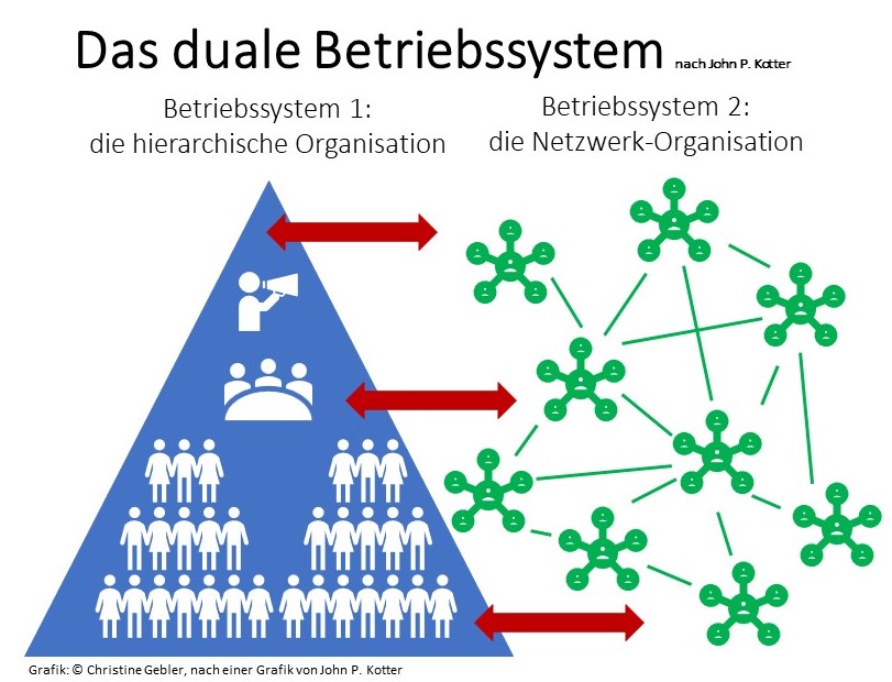 Parallel zur klassischen Organisation und ihrer Steuerungsroutine braucht es nach Kotter eine zweite, dauerhaft eingerichtete Struktur, die auf dem Start-up-Mindset und der Zusammenarbeit in Netzwerken basiert.