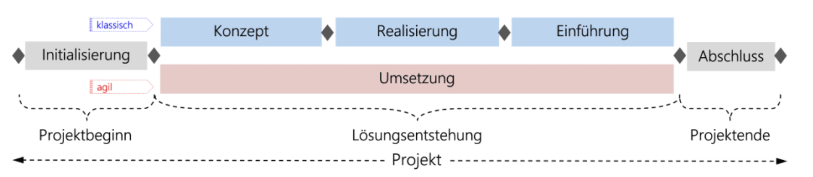 Ab „Phase 2“ nach Iteration Zero bzw. Initialisierung ist es abhängig vom Projektinhalt, ob und wann agiles und ob und wann klassisches Projekthandeln greifen. In jedem Fall ist es meist hilfreich, eine Rollenaufteilung wie Product Owner («die das Produkt vertritt») und Scrum Master («die Methoden hütet,das Team schützt und arbeitsfähig hält»), ein Vorgehen, das aus der agilen Welt geschöpft ist. Gleichzeitig tut es auch agil arbeitenden Projekten gut, wenn die Projektphasenreifestufe bewusst ist und genutzt wird (Produkt erdenken, Produkt herstellen, Produkt zum Fliegen bringen und ausprobieren lassen, Produkt nutzen …), was eher aus dem Klassischen, in unserem Fall dem Hermes-Projektmanagement kommt. In jedem Fall braucht es erfahrene Projektmenschen im Projekt, die das beurteilen und entscheiden können.