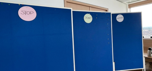 Abschließend führt das Design Team eine Retrospektive durch, um die Erfahrungen aus dem Design Thinking Prozess zu reflektieren und daraus für weitere Aufgabenstellungen zu lernen. Es wird die Methode “Stop – Start – Continue“ genutzt, um festzuhalten, welche Ansätze nicht weiterzuverfolgen sind, was neu eingeführt werden sollte und somit man weitermachen möchte.