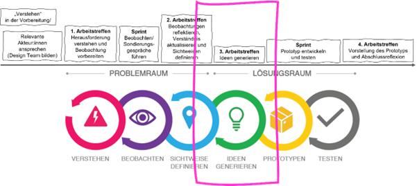Methode „Design Thinking“. Durch die Anwendung dieser agilen Methode können neue Denkansätze für kreative Lösungen von neuen Aufgabenstellungen entwickelt werden, die die Bedürfnisse der Nutzenden befriedigen.