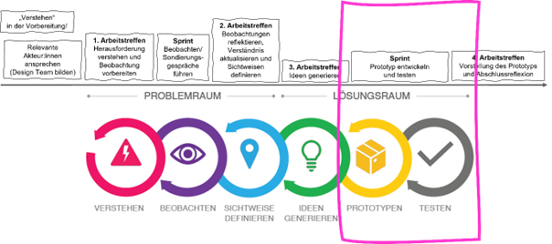 Design Thinking besteht aus sechs Phasen, den sogenannten Sprints, in denen die beteiligten Akteur:innen idealerweise aus unterschiedlichen Teams, Referaten, Abteilungen und ggf. von extern im sogn. Design Team (zusammen) arbeiten, um gemeinsam Lösungen für ein zu benennendes Problem – der Design Challenge – zu finden. Zwischendrin trifft sich die Gruppe zu Arbeitstreffen, um die Ergebnisse auszutauschen, den aktuellen Stand zu reflektieren und die nächsten Schritte miteinander zu vereinbaren. Und damit geht es los: Im “Problemraum” geht es zunächst darum, das Problem zu verstehen, die Bedürfnisse der unterschiedlichen Stakeholder zu beobachten und die unterschiedlichen Sichtweisen auf das Problem zu analysieren. Erst im nächsten Schritt, nun im sogn. “Lösungsraum”, werden Ideen generiert, Prototypen entwickelt und getestet. Dabei gilt: Die einzelnen Phasen müssen nicht so trennscharf ablaufen, wie dargestellt. Manchmal ist es erforderlich auch nochmal einen Schritt zurückzugehen und eine Phase bzw. einen Sprint zu wiederholen. Beispielsweise könnte sich in der dritten Phase herausstellen, dass das Problem doch anders gelagert ist als zunächst erwartet – dann heißt es, wieder in Phase eins oder zwei weiterzumachen. Auch ist nicht zwischen allen Phasen ein Arbeitstreffen obligatorisch – das hängt vom jeweiligen Arbeitstand ab und wird im Design Team vereinbart. Das entspricht also einem sogn. iterativen Vorgehen, das typisch für agile Arbeitsweisen ist.