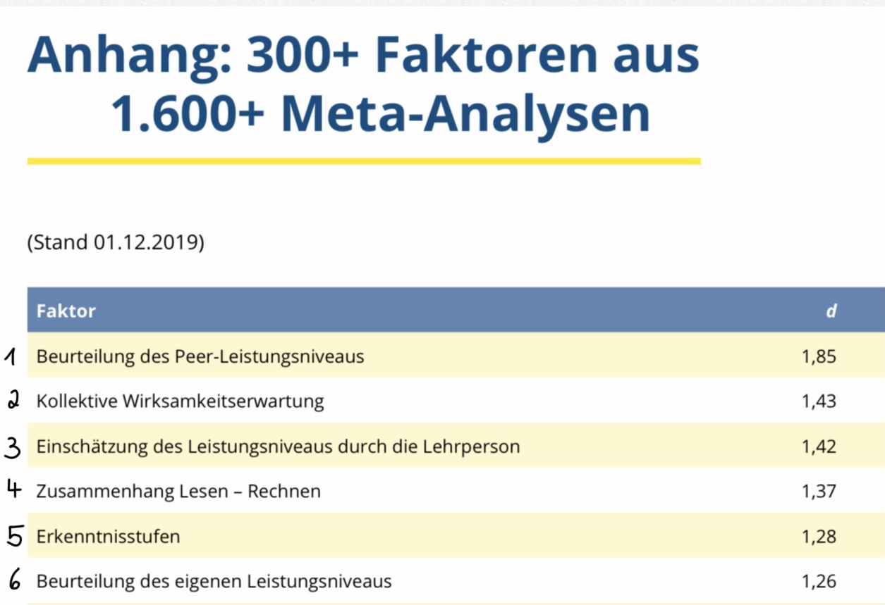 Die Hattie-Studie – ich muss das kurz erklären – ist die größte Bildungsstudie weltweit, die wissenschaftlich unbestritten beschreibt, welche Faktoren sich denn in der Schulpraxis wirklich effektiv auf die Lernleistung auswirken. Inzwischen sind es über 300 Faktoren. John Hattie ist übrigens Professor für Erziehungswissenschaften und Direktor des Melbourne Education Research Institute an der University of Melbourne, Australien. Hier geht es zu den neuesten Studienergebnissen, falls sich jemand darin vertiefen will.