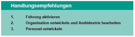 Zusammenfassend ergeben sich hieraus drei Handlungsstränge, die dazu beitragen, dass agile Prinzipien nicht nur auf individueller Ebene genutzt werden, sondern dass auch strukturelle Änderungen in der Organisation ermöglicht und somit eine den Herausforderungen der dynamischen Umwelt entsprechenden Haltung bzw. Kultur gefördert wird: