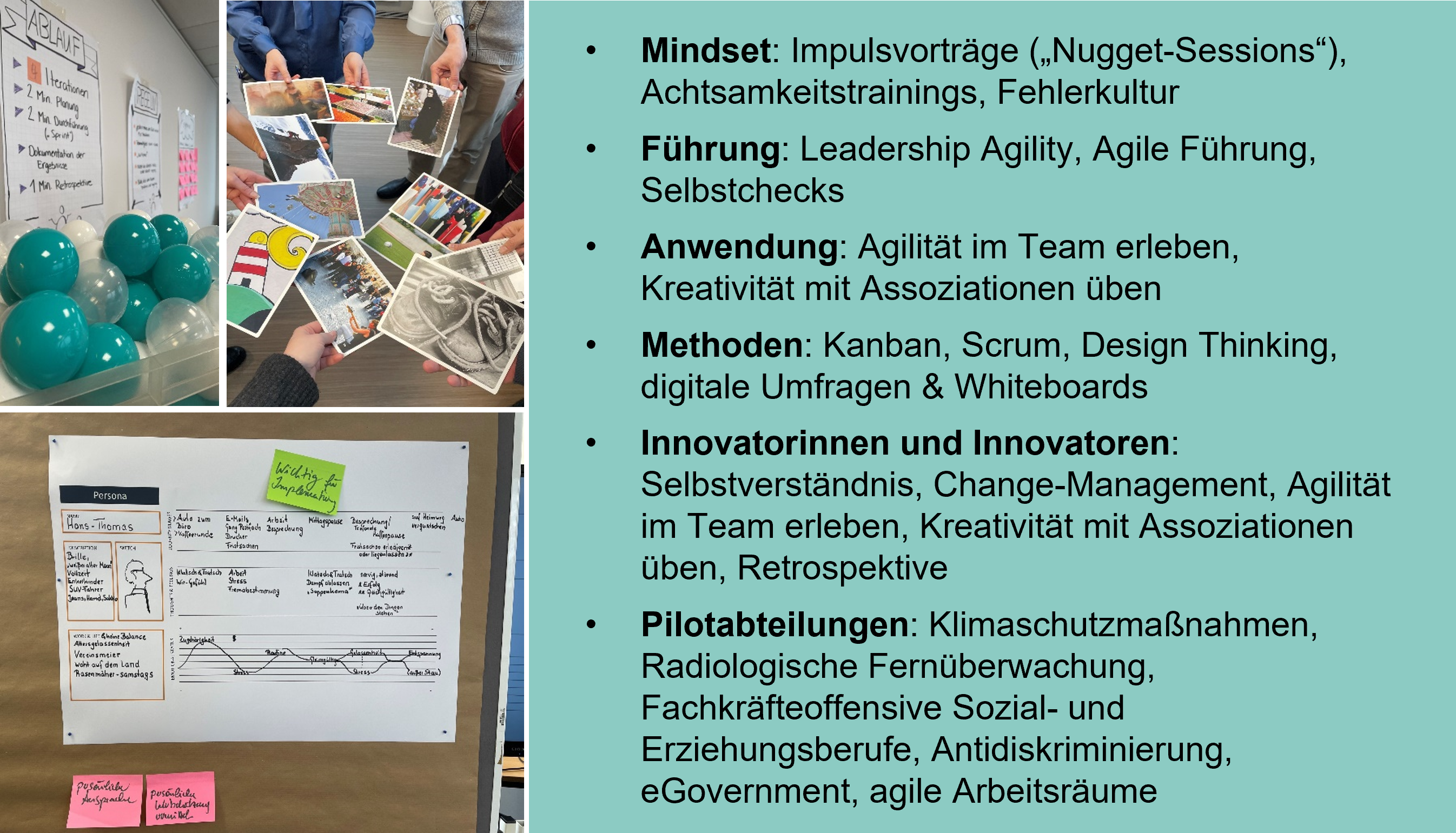 - Vermittlung agiler Methoden: In dieser Phase wurden gezielt Schulungen und Workshops angeboten, um den Mitarbeitenden ausgewählte agile Arbeitsweisen zu vermitteln. Dazu gehören beispielsweise Scrum, Kanban oder Design Thinking. Die Teilnehmenden lernten die methodischen Grundlagen ebenso wie Ansätze für die praxisorientierte Anwendung im Verwaltungsalltag.