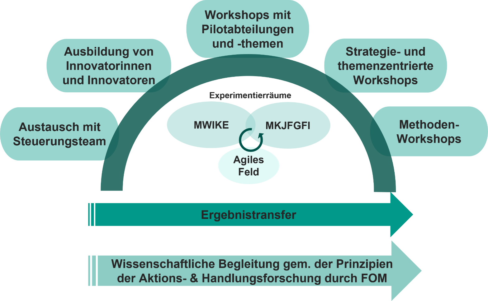 Zielsetzung des Projekts war es, durch die Erprobung agiler Arbeitsweisen die Beschäftigten der Ministerien für Wirtschaft, Industrie, Klimaschutz und Energie (MWIKE) sowie für Kinder, Jugend, Familie, Gleichstellung, Flucht und Integration (MKJFGFI) zu befähigen, auf kurzfristige und unerwartete Veränderungen schneller und flexibler zu reagieren. Das Projekt zielte darauf ab, Erfahrungen zu sammeln, eine agile Haltung zu entwickeln und entsprechende Methoden anzuwenden.