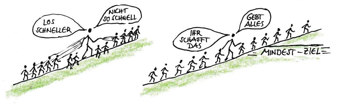 Zum pädagogischen Zaubern muss der Lehrende von seiner Wissensvermittlungsburg heruntersteigen, sich unter seine Kunden mischen, ihnen über die Schultern sehen und mit ihnen zusammen am gemeinsamen Lernen arbeiten. Und damit selbst zum Lernenden werden. Denn das Ziel ist zwar klar, den optimalen Weg findet man aber nur entwicklungsorientiert und gemeinsam.