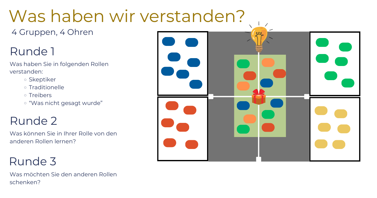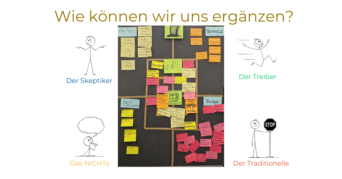 Als wir darüber nachdachten, welche Lektionen wir aus den anderen Rollen ziehen können, wurde mir bewusst: Jede Rolle ist wichtig für das Projekt. Es ist gut, wenn uns das „NICHTS“ auf unsere blinden Flecken hinweist. Es ist gut, wenn uns der „Traditionelle“ auf Dinge aufmerksam macht, die uns als Abteilung einzigartig machen. Für die Rolle des „Kritikers“ war es bereichernd zu hören, dass die „Treiber“ von uns lernen möchten, Risiken zu erkennen, bevor sie unüberlegt ins nächste Abenteuer stürzen.