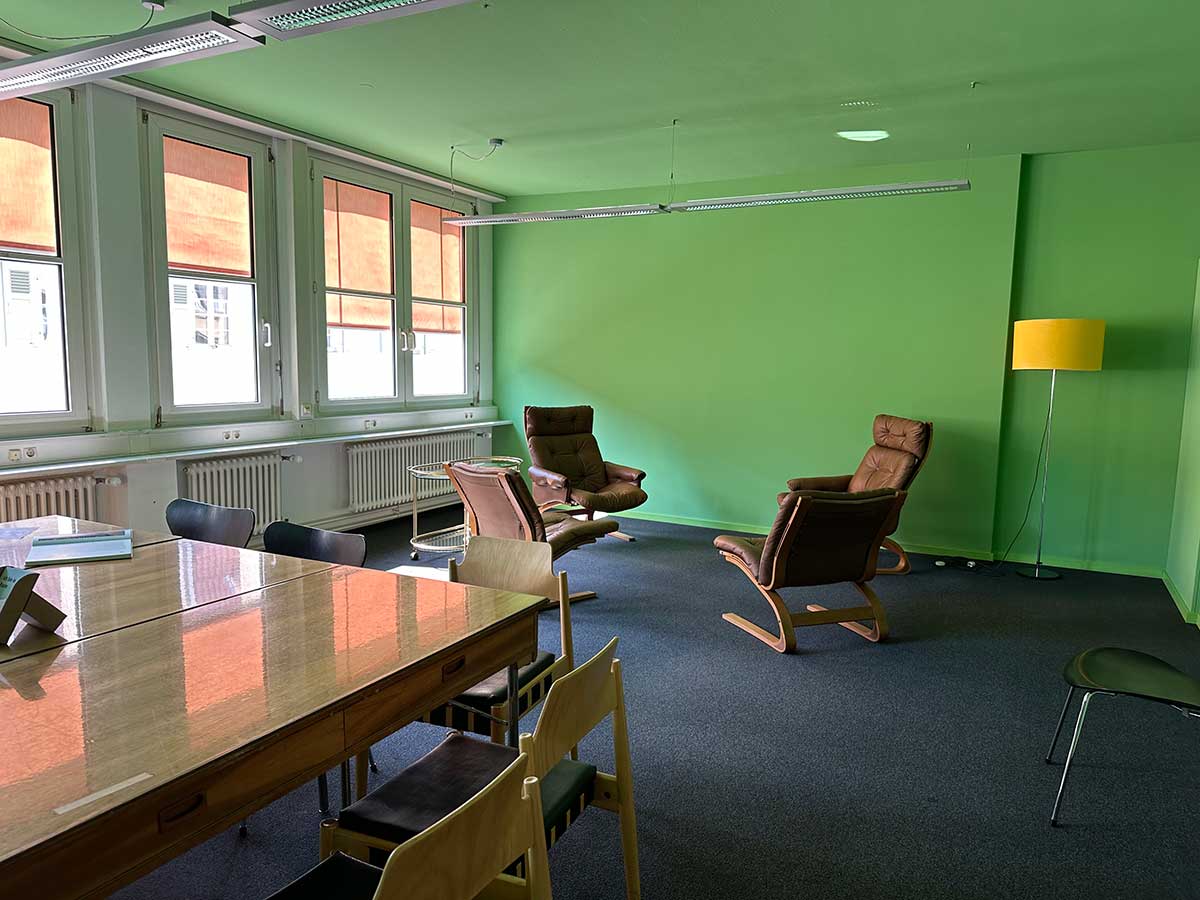 Für die Möblierung wurde nichts neu beschafft. Vielmehr wurden gebrauchte Möbel unterschiedlicher Herkunft (auch private Spenden sind darunter) aufbereitet.