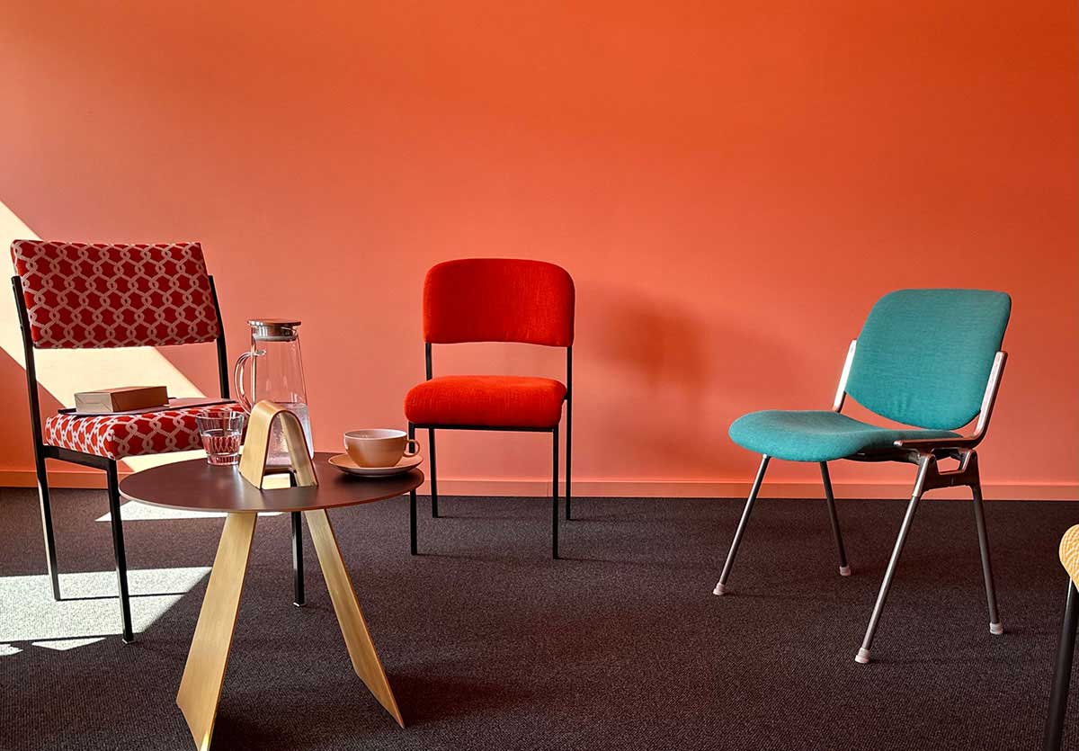 Hochbau und Gebäudewirtschaft. Das bedeutet: Architektinnen und Architekten sind am Werk. Gute Gestaltung ist ein Muss. Für die neuen Räume wurde deswegen ein Farbkonzept entwickelt, das mit kräftigen Farben arbeitet. Die Farbpalette wurde inspiriert durch eine mit Designpreisen ausgezeichneten Geschirrserie („Futurismo“), die in ihrer Farbigkeit eine Hommage an die Rebellen der Futurismus-Bewegung darstellt.