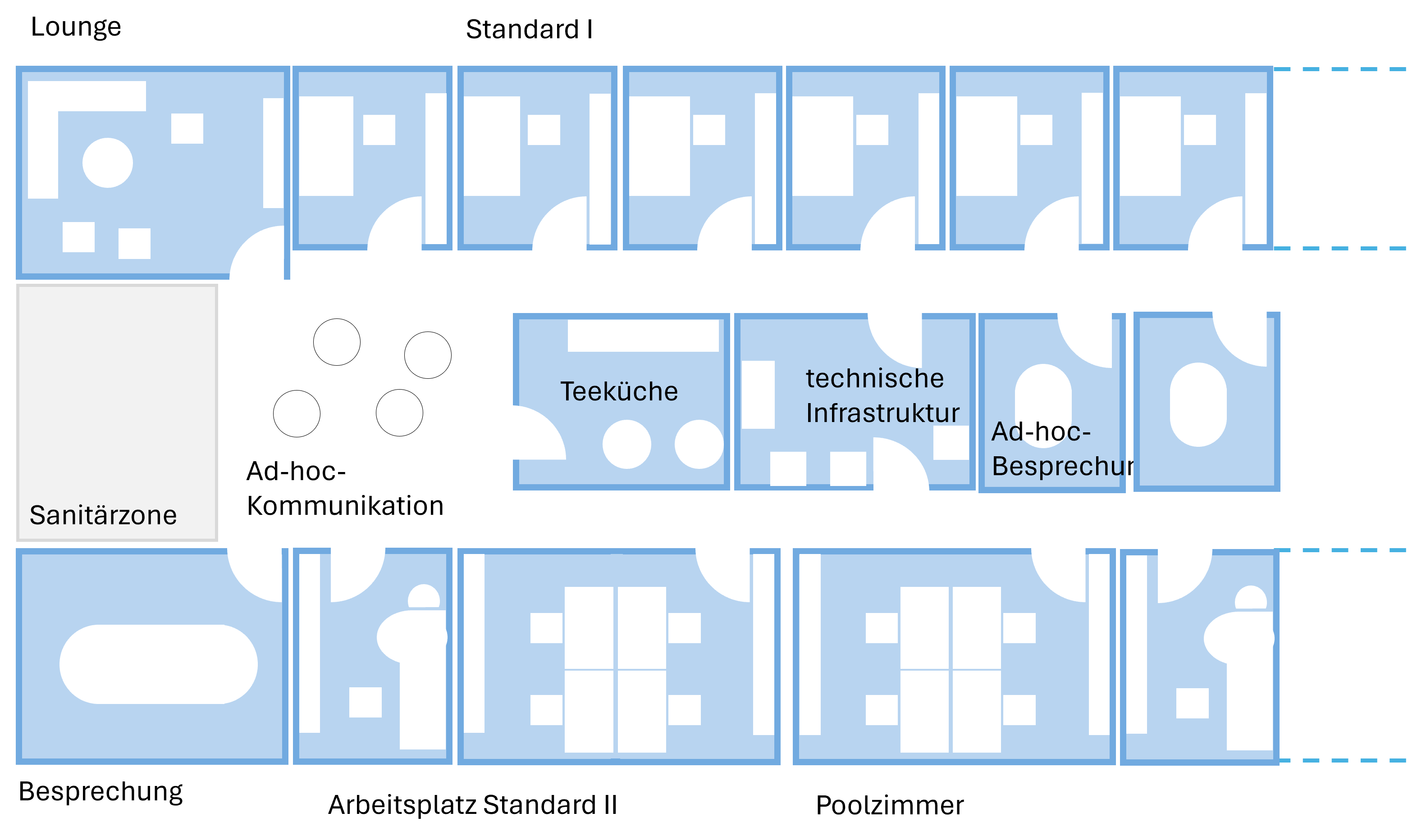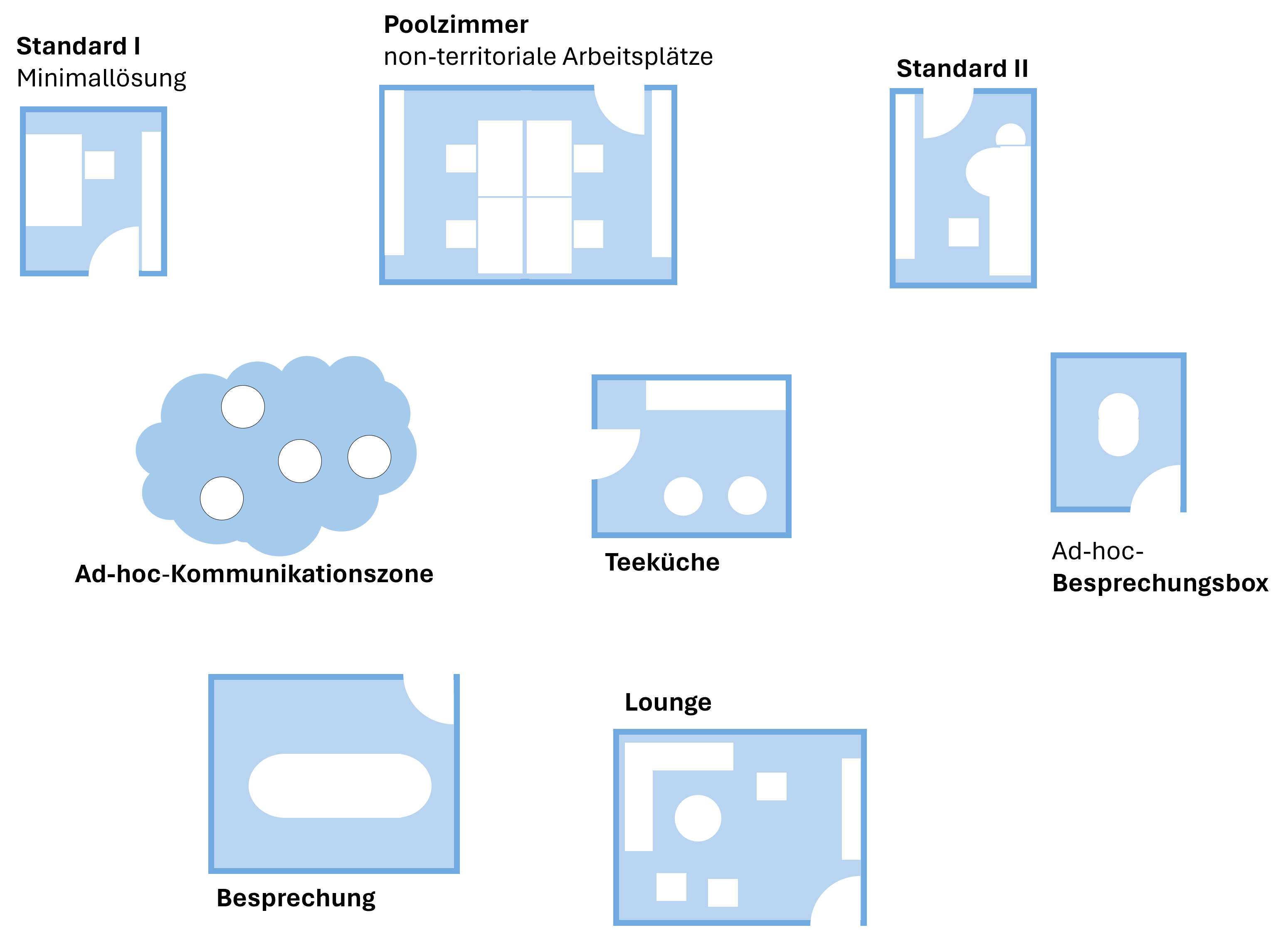 An die Stelle der klassischen Büros (Einzel-, Zweier- und Gruppenbüros) für Sachbearbeiter und Sachbearbeiterinnen, sowie entsprechend der Position größere Büros für Führungskräfte, alles links und rechts eines Flurs aufgereiht, können nun differenzierte Raumkonzepte treten, die sich vor allem an den zu erledigenden Aufgaben orientieren.