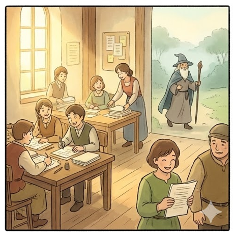 Die Leiterin weinte vor Freude. „Das ist wirklich wahr?“ Der Wanderer nickte. „Zahlen lügen nicht. Aber wisst ihr, was noch wichtiger ist? Schaut auf eure Schreiber:innen.“ Und die Leiterin sah es: Die Schreiber:innen waren nicht mehr müde und verbittert. Sie lachten. Sie sprachen miteinander. Ein neuer Bursche hatte sogar eine Idee für ein automatisches Zahlungsschreiben gehabt – etwas, das der alte Schreibmeister gar nicht für möglich gehalten hatte.